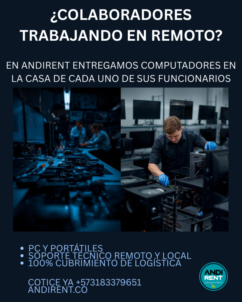 Una de las consultas más frecuentes que recibimos es sobre la renta de computadores para trabajo en casa en Colombia. En Andirent llevamos el computador, el escritorio, la silla y todos los elementos necesarios directamente al domicilio de cada colaborador, con soporte técnico remoto y en sitio incluido.